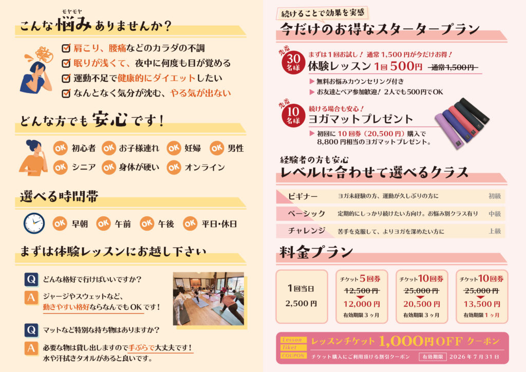 これからもみなさまの日常によりよくヨガが生きるように、分かりやすくレッスン内容や時間を見直しました。